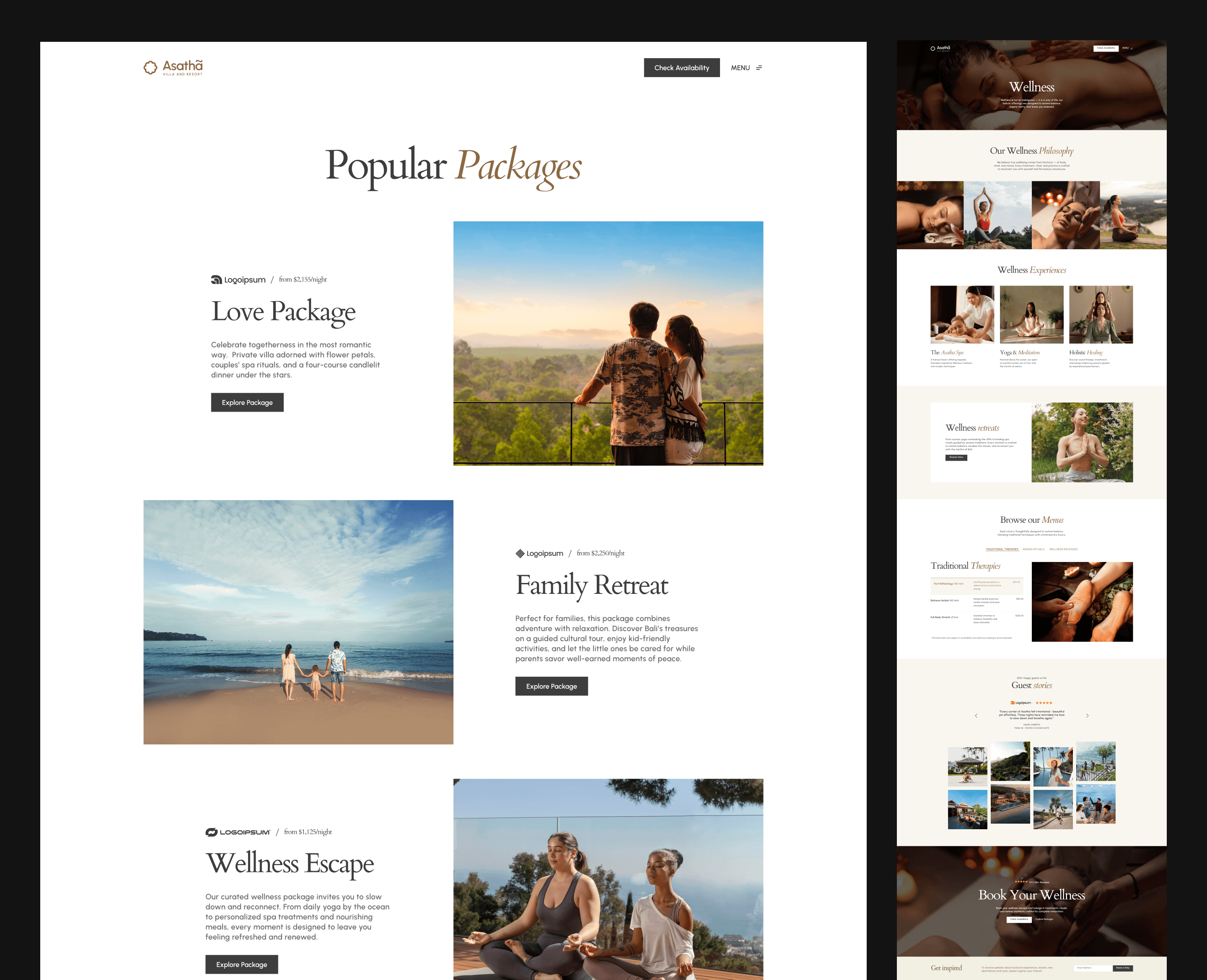 Built for brands that sell experience, tranquility, and atmosphere, Asatha allows you to highlight suites, showcase wellness rituals, feature fine dining, present curated packages, and share real guest stories — all within a high-end, emotionally engaging design.