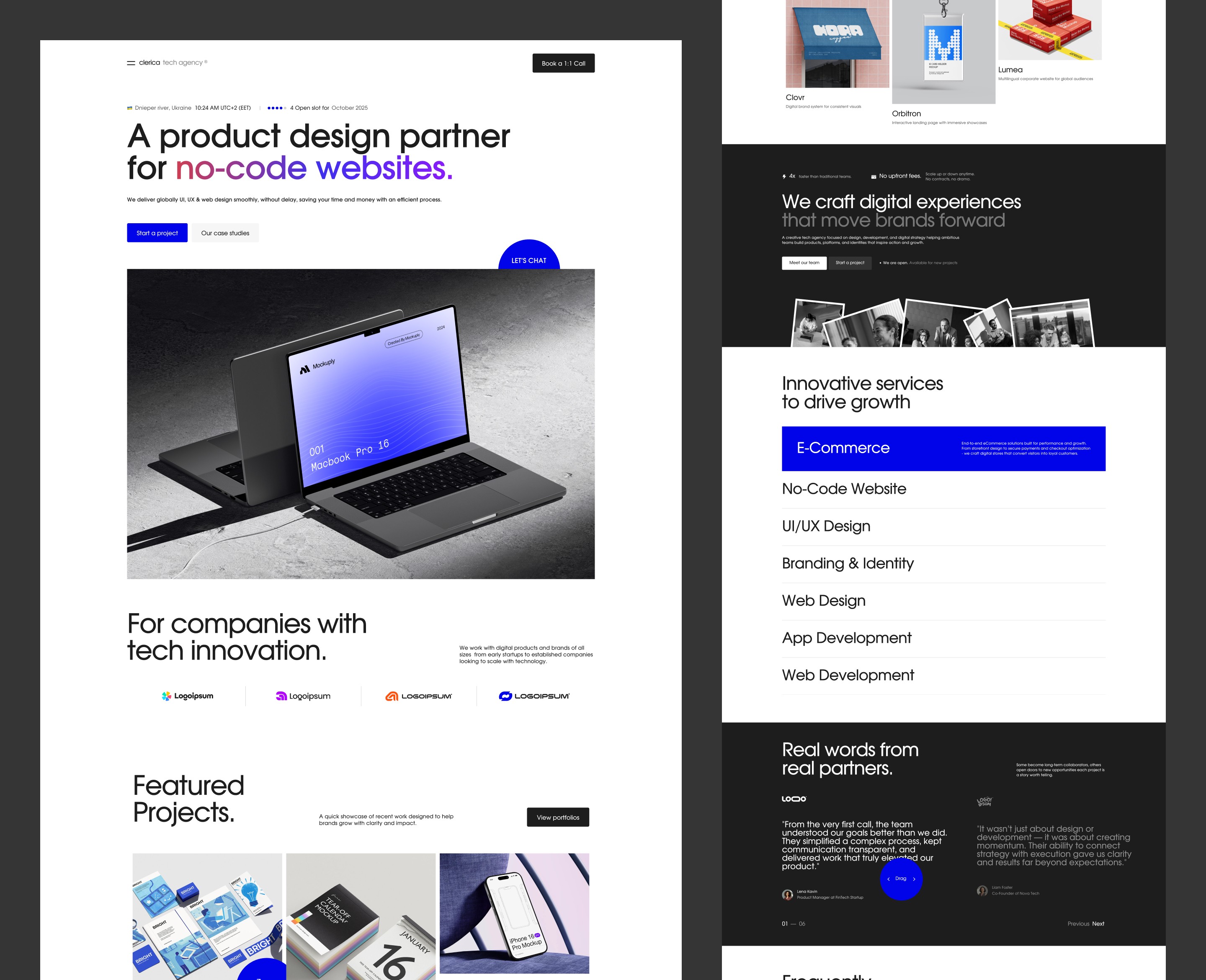 Home – A strong agency introduction with service highlights, work previews, testimonials, pricing teasers, and CTAs.